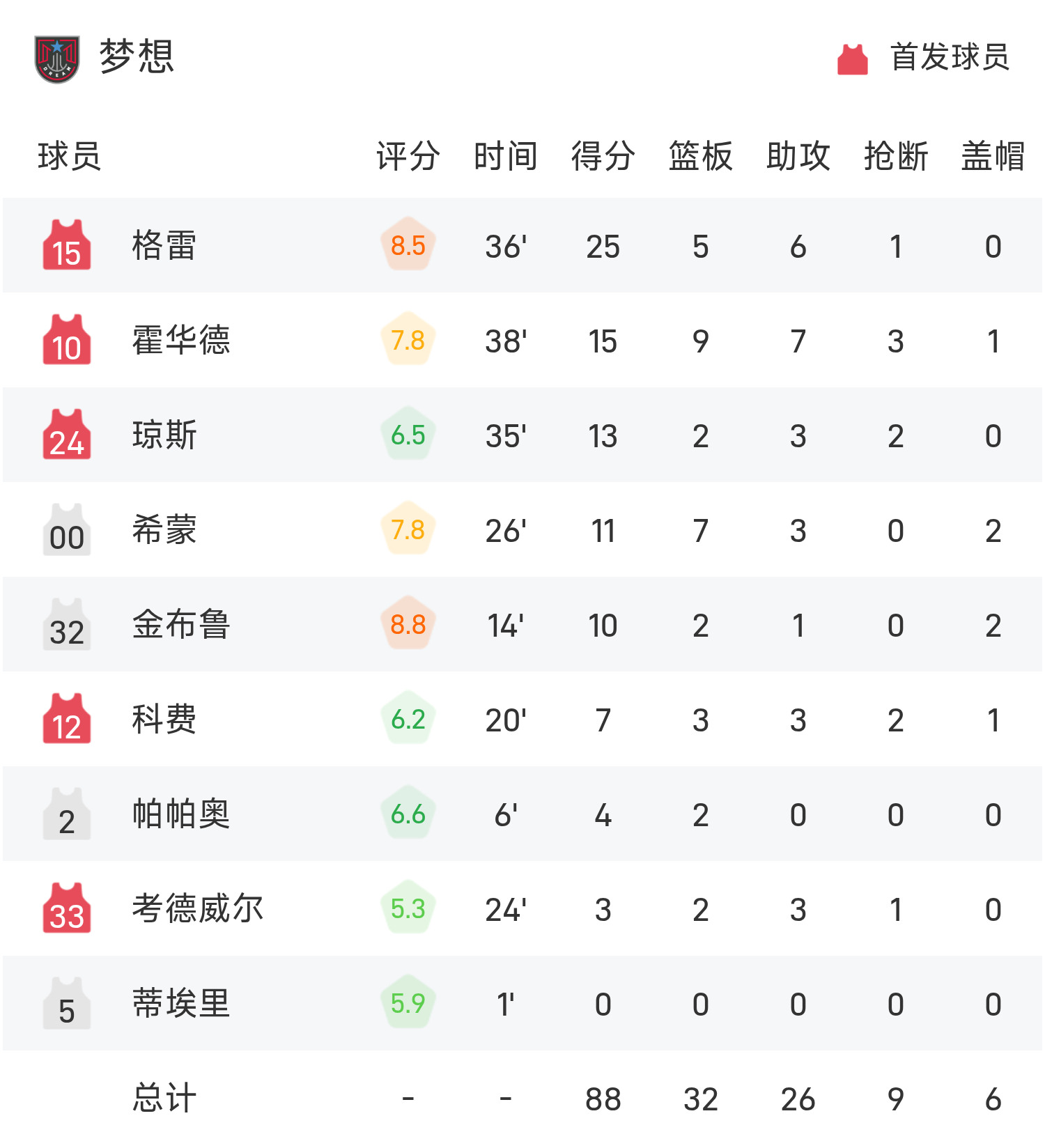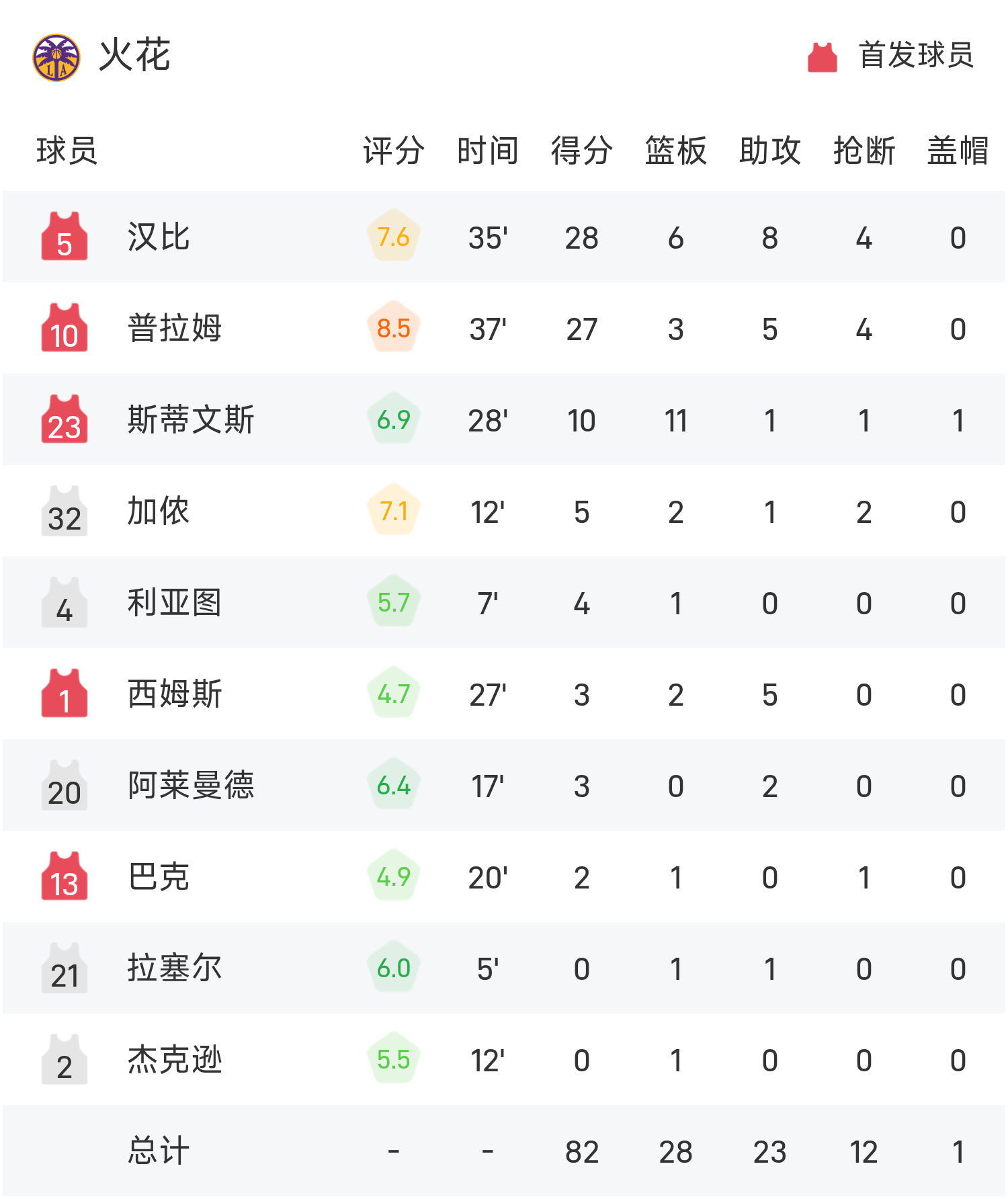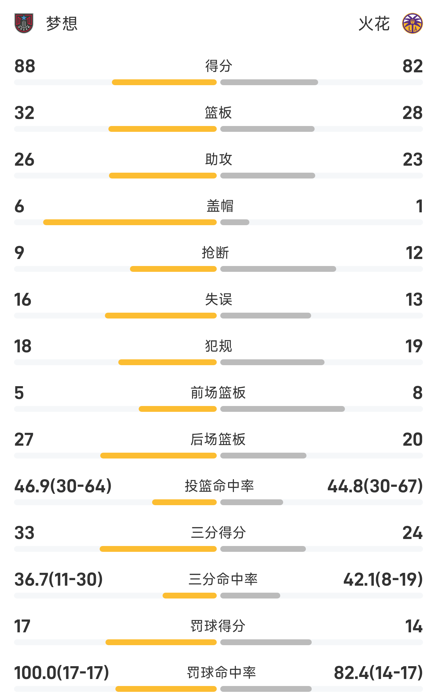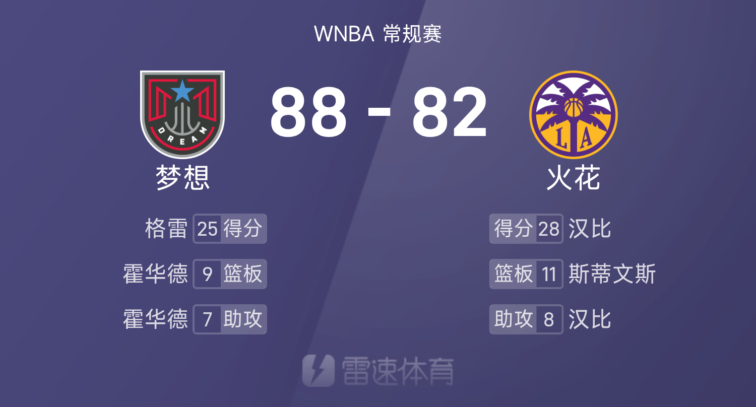 05月28日讯 25赛季WNBA 常规赛,火花对阵梦想。双方全场战罢,火花82-88不敌梦想。格雷得到25分5板6助率队取胜,汉比空砍全场最高的28分6板8助。
